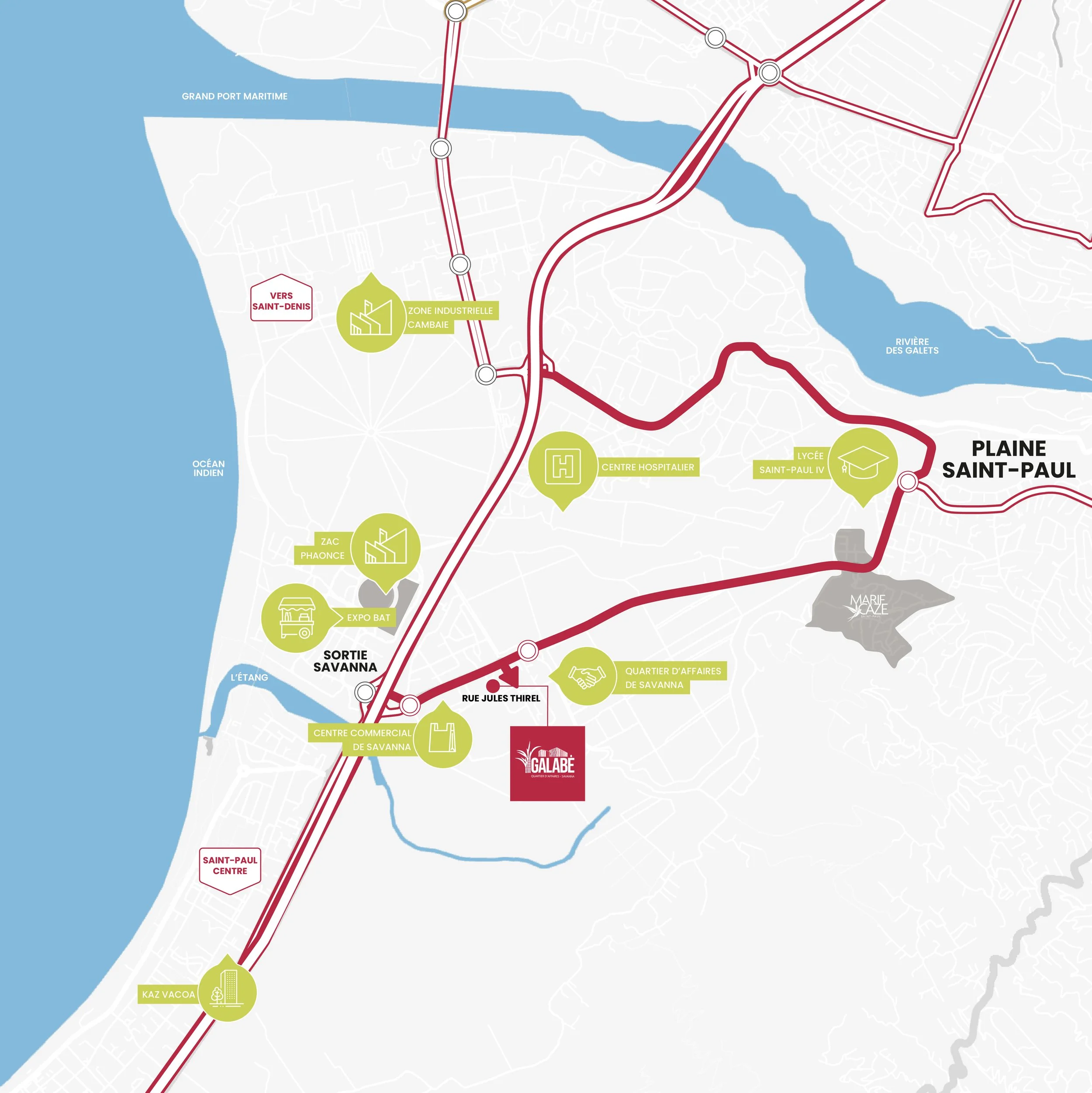 Le passage récent en 3 voies sur la route nationale ainsi que la modification des ronds-points de la zone commerciale de Savanna améliorent considérablement le flux routier pour accéder au Quartier d’Affaires.